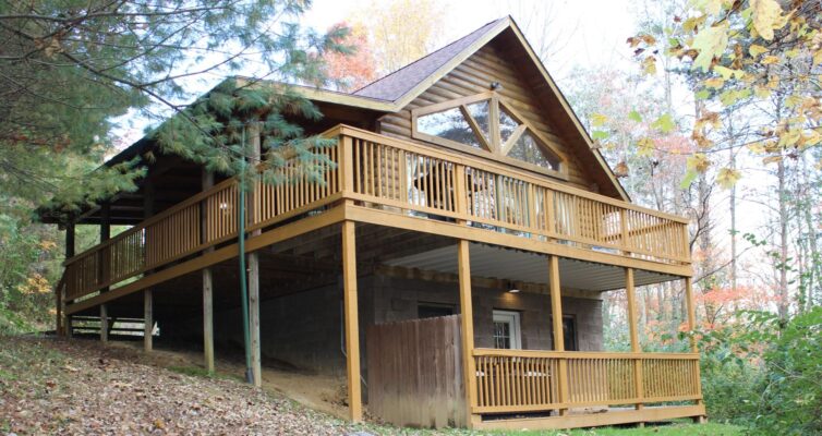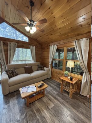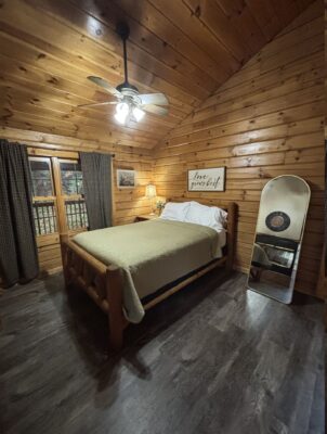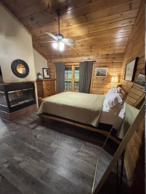 Kennedy, one of the great Hocking Hills secluded cabin rentals, offers a perfect escape for two guests. This intimate cabin features an open floor plan, a cozy bedroom on the main floor with a Queen-size bed, and the added convenience of two bathrooms. A three-sided wood-burning fireplace graces the cabin, visible from both the bedroom and the fully equipped kitchen and living room.