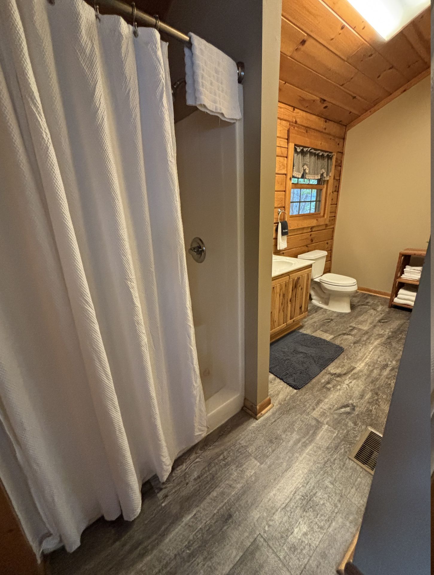 Kennedy, one of the great Hocking Hills secluded cabin rentals, offers a perfect escape for two guests. This intimate cabin features an open floor plan, a cozy bedroom on the main floor with a Queen-size bed, and the added convenience of two bathrooms. A three-sided wood-burning fireplace graces the cabin, visible from both the bedroom and the fully equipped kitchen and living room.