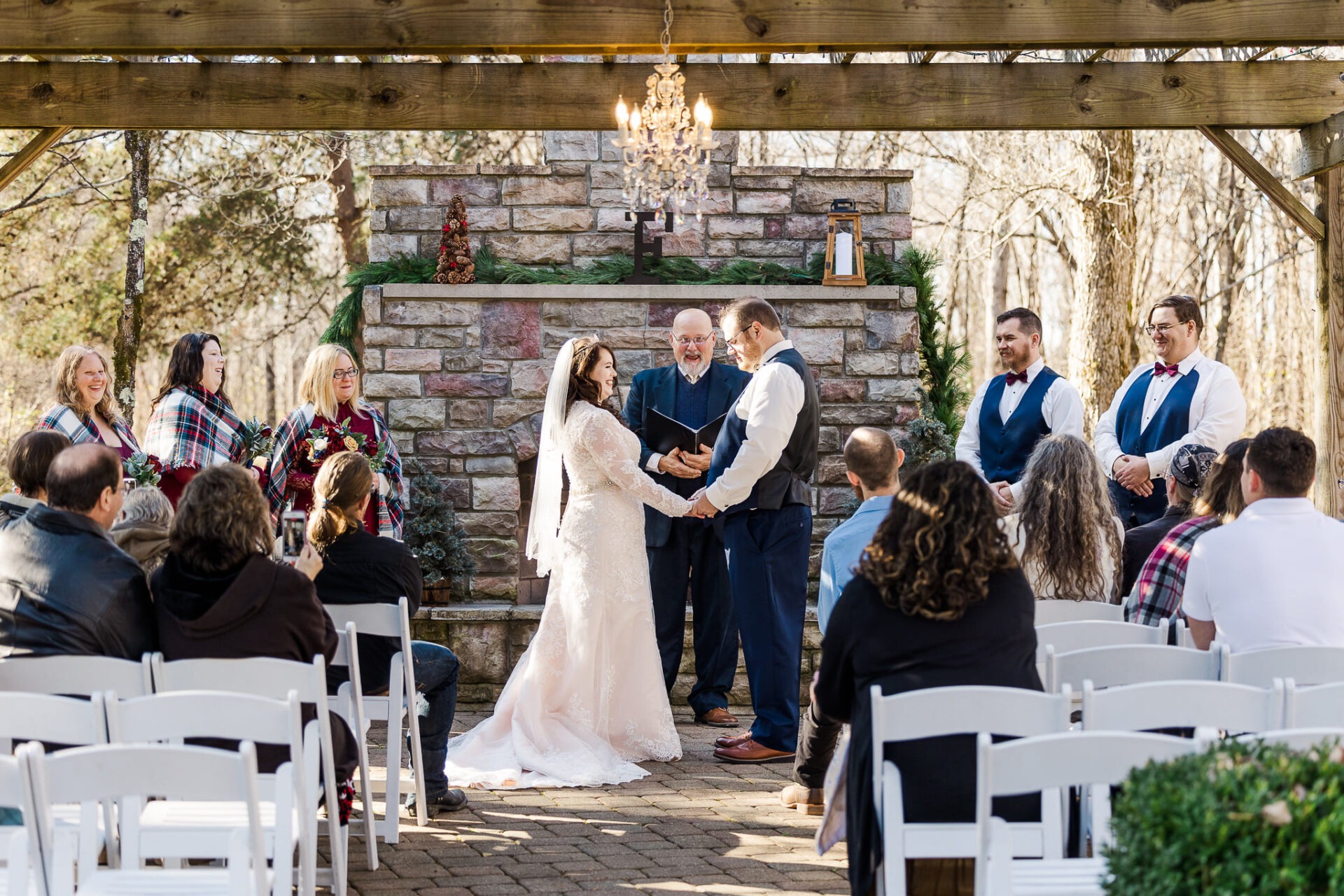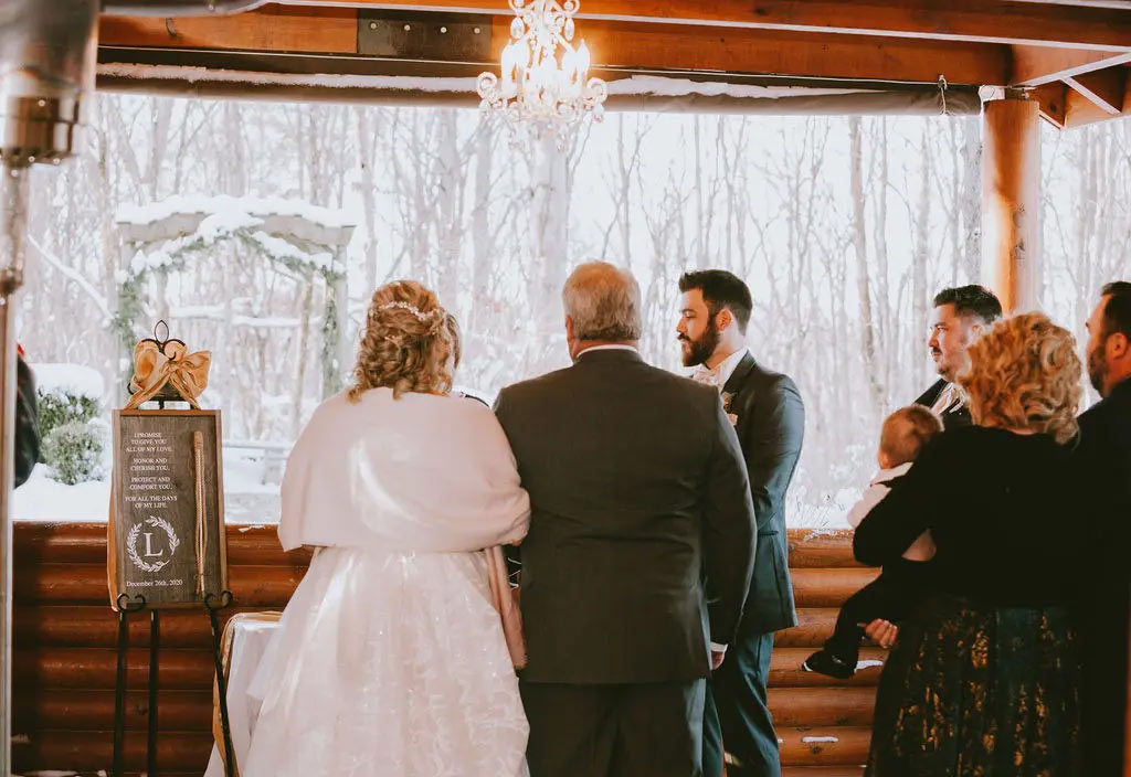 Winter weddings at Valley View Cabins combine the quiet elegance of the season with the natural beauty of Hocking Hills. Our Hocking Hills Wedding Chapel is our intimate, year-round venue ideal for elopements and small weddings. During the winter months, couples can choose from the charming Log Chapel, the cozy Log Gazebo, or the scenic Stone Fireplace with a pergola. The chapel offers customizable wedding packages, designed to make your special day stress-free. All packages come with a day-of-wedding coordinator and exclusive property use. We’ll also assist with floral arrangements and photography.